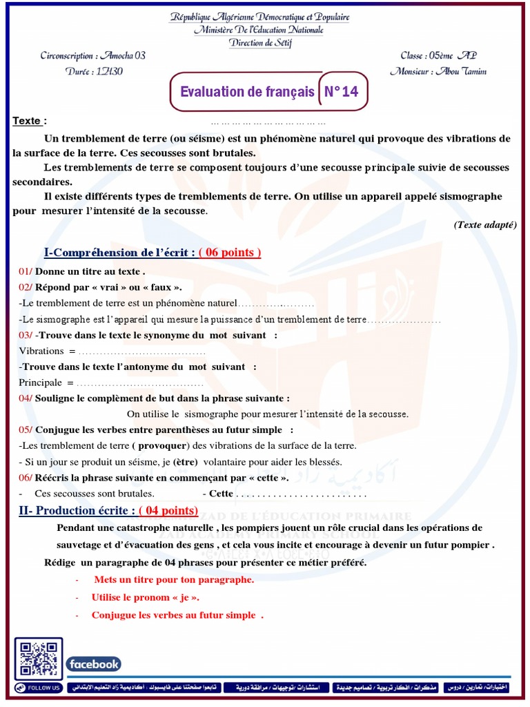 Classés par pays, type, villes etc. Si nous savions avec anticipation que le tremblement de terre ne sera pas assez fort pour faire s'écrouler la maison, on pourrait se cacher sous la table en toute confiance. Les tremblements de terre arrivent de temps en temps et nous ne pouvons absolument pas savoir si cela nous arrivera demain. الصفحة الرئيسيةسنة ثانيةguide de maitre deuxième année primaire. Examen de fin de cycle primaire session 2020.